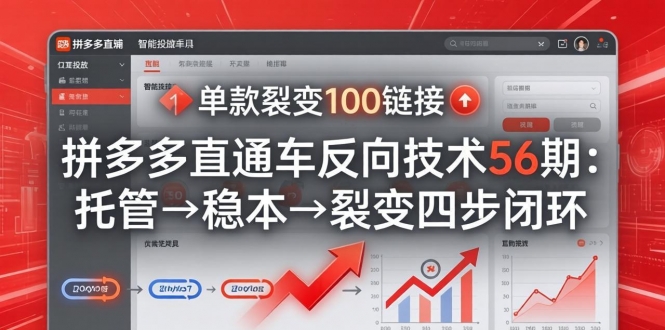 本课程是《拼多多打爆班》原创技术第56期,聚焦“直通车反向技术”,帮助商家精准卡位同行、快速打爆链接、抢占市场份额。课程系统拆解托管-稳本-裂变-托管四步核心玩法:第1步先