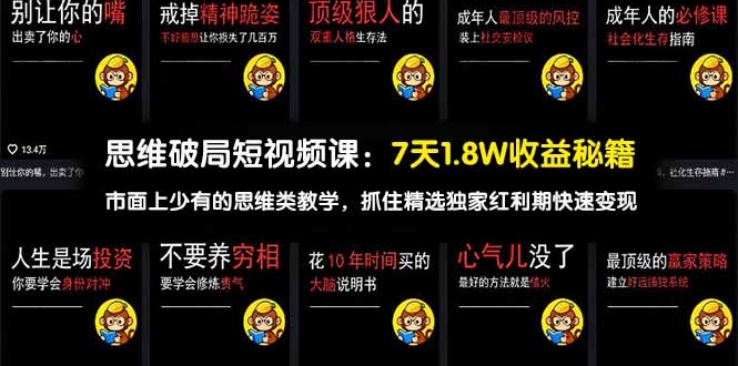 本课程是一套思维破局短视频制作教学,聚焦伙伴计划与精选独家变现路径,作者7天收入1.8W。课程系统讲解**心态总览篇理论**(思维破局的核心认知)、**视频如何能爆理论**(爆款