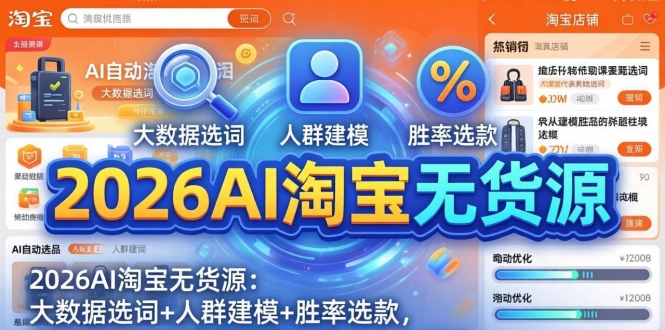 本课程是2026年3月最新AI淘宝无货源电商课程,专为0基础新手设计,用AI自动化搭建一套可复制的闭环系统。课程系统讲解**AI驱动下的2026无货源新生态与盈利底层逻辑**、**AI大数据