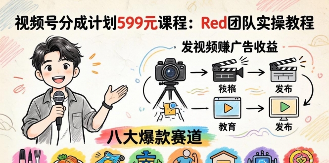 本课程是Red团队价值599元的视频号分成计划实操教程,在视频号发视频即可获取官方广告分成收益。课程涵盖**什么是分成计划**、**开通分成计划要求**、**新闻热点赛道**(软件制作